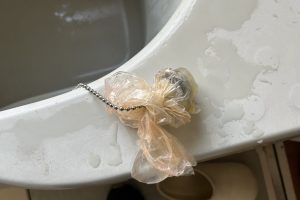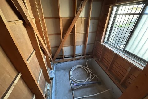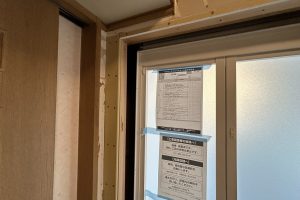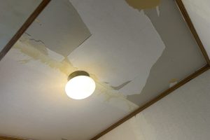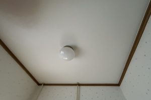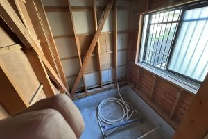 - 脱衣所のクロスも全面張替。下地が悪いのでパテで補修します。